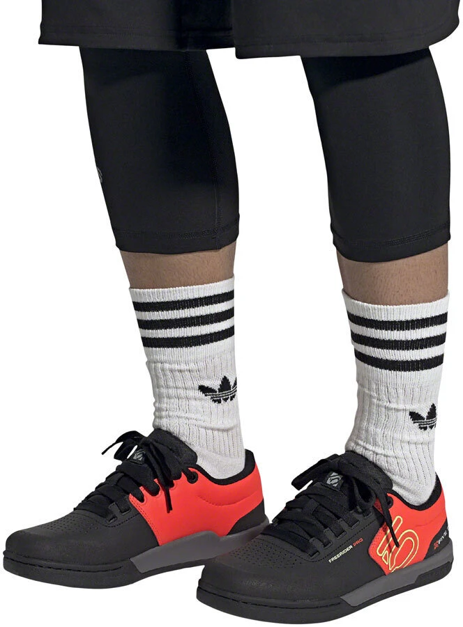 The adidas Five Ten Freerider Pro Mountain Bike Shoes match proven flat pedal control with enhanced impact coverage and a quick-drying synthetic upper. Cushioned and water-resistant, they offer comfort for full days on the bike. Stealth S1 rubber and a Dotty tread offer the legendary pedal control you expect from the Freerider.