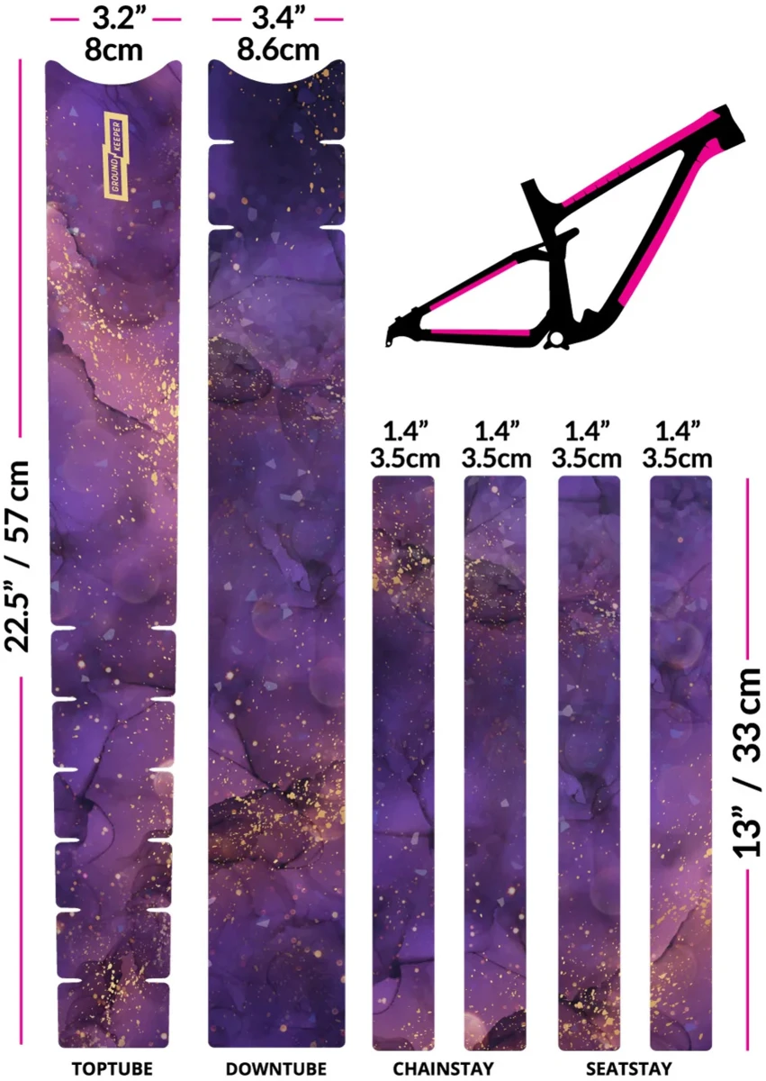 Universal kit designed to fit all bikes and sizes. Includes 6 easy-to-trim pieces for top tube, downtube, chainstays, and seat stays.