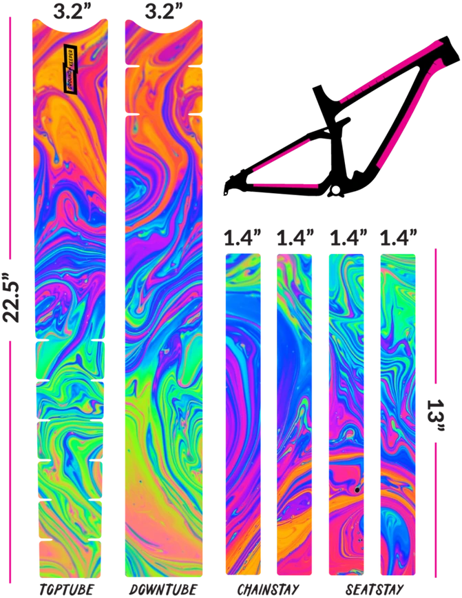 – Universal kit designed to fit all bikes and sizes. Comes with 6 easy-to-trim pieces for toptube, downtube, chainstays, and seatstays. Designed to fit XL frames, and is easy to trim down to the desired size.