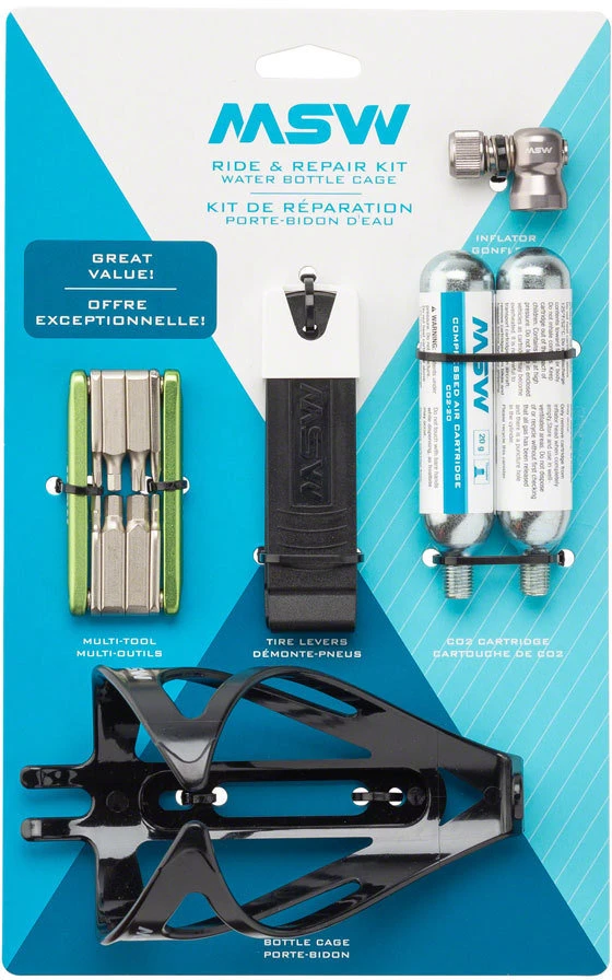 – This Ride and Repair Kit has a water bottle cage as well as everything needed for common road-side fixes: an eight-piece multi-tool, three tire levers, CO2 inflator & cartridges.