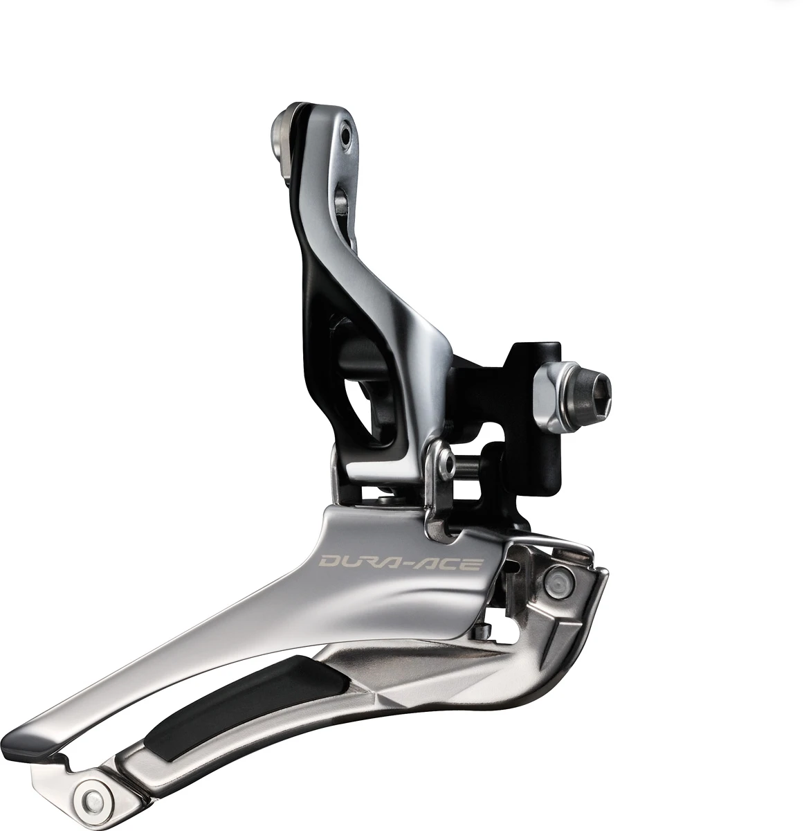 The Dura-Ace 11-Speed Front Derailleur is Shimano’s top-of-the-line front changer. The body is made of cold-forged aluminum for weight savings and high strength, and the pivots are spaced extra wide for amazing shifting. Through a redesigned pull arm and change in actuation ratio, Shimano has reduced the shifting effort by 43% while also reducing the throw of the shift lever for the fastest, easiest, smoothest front shifting yet. Plus, the lightweight aluminum cage is nickel plated for superior durability.