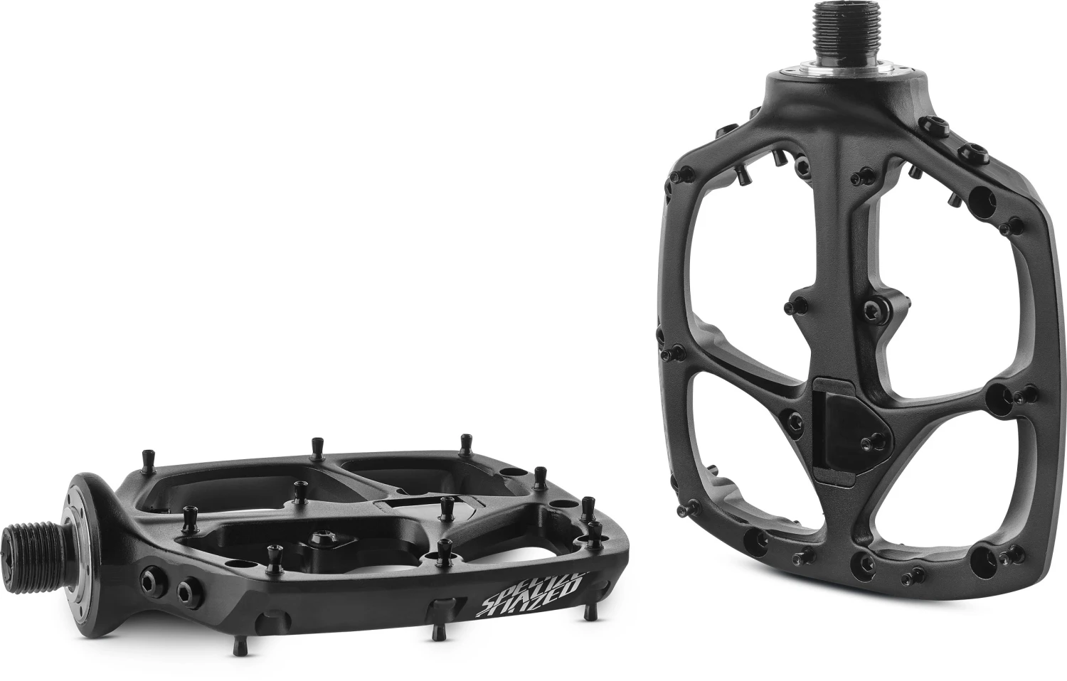 Specialized’s Boomslang Platform Pedals are insanely thin, yet still wickedly strong. A tapered outside pedal edge provides maximum grip and ground clearance, while the super low-profile design—a mere 10mm at the center—is like a direct telepathic line from your body to the bike. Custom undercut pins provide incredible traction and are simple to remove, and should one break during your ride, each pedal carries four hidden pins for easy replacement.