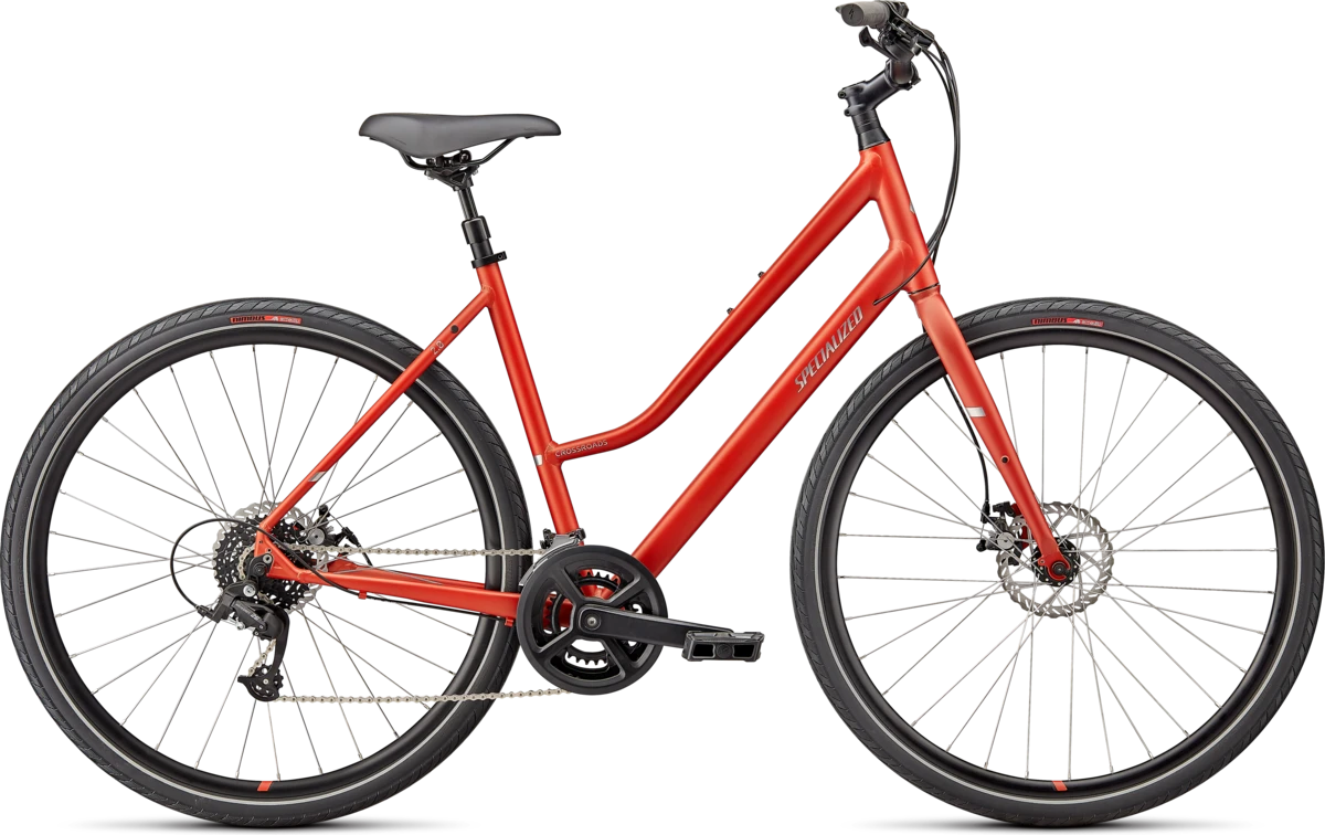 The Crossroads is your companion to a better, fitter, and happier you—whether it be along the road or dirt path. It features a comfortable, upright geometry with a step-through design that makes it easy to put a foot down at a stop, and reflective elements that increase your visibility to motorists in low-light conditions.