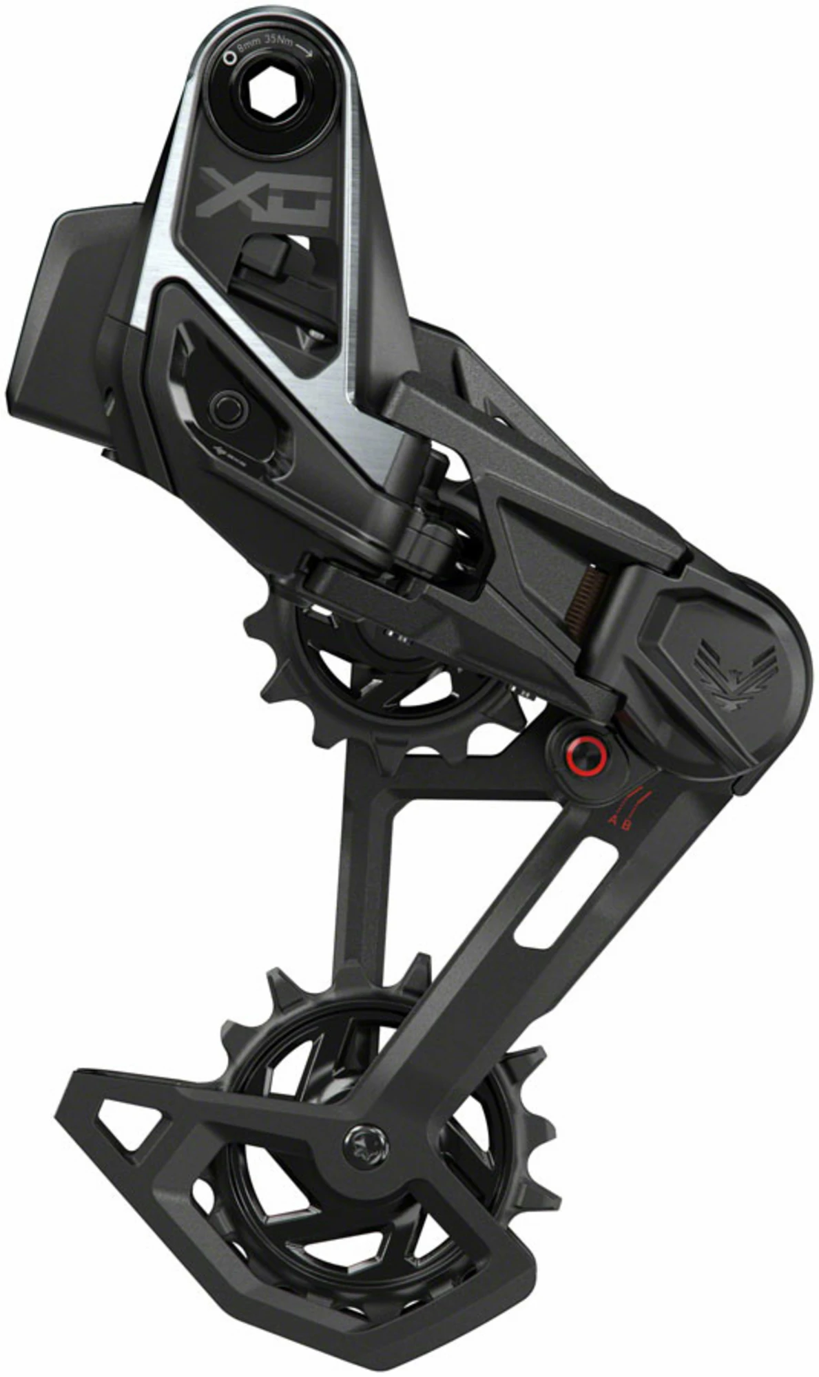 – X0 Eagle Transmission derailleur; Engineered as integrated, interdependent transmission components, the X0 Eagle T-Type rear derailleur mounts around the wheel axle itself, contacting the cassette directly with a first-of-its-kind Hanger-less Interface